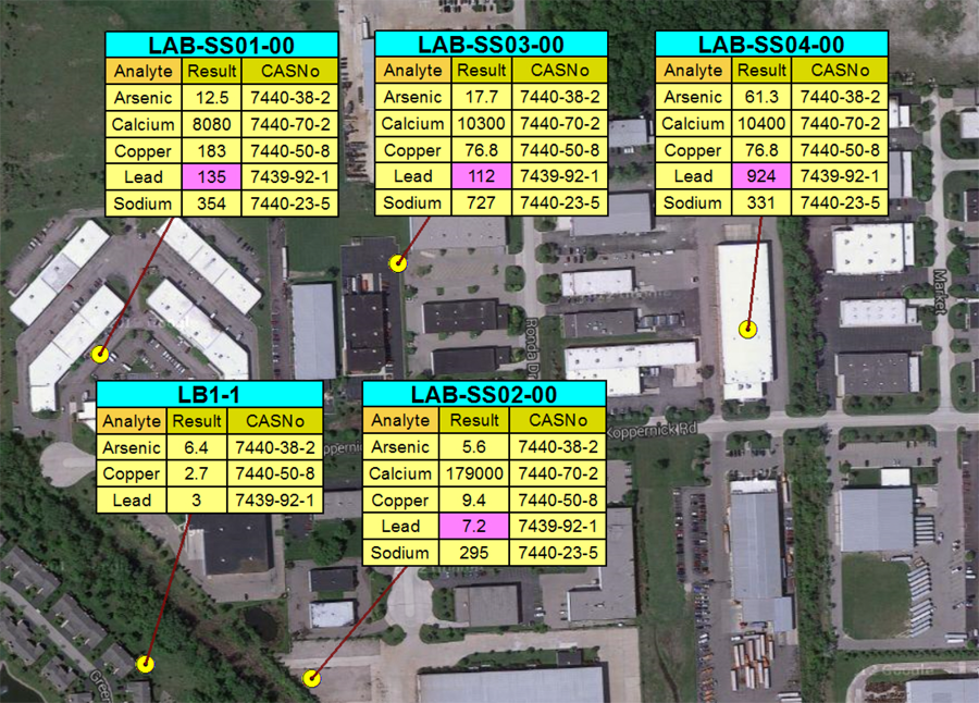 Some GIS specialists may utilize this tool for the creation of illustratively appealing chem-boxes or data-tables to represent their complex environmental data for ESA/Phase II reports. geoCallout® is a powerful tool to provide a dynamic interface between the analytical and spatial data.